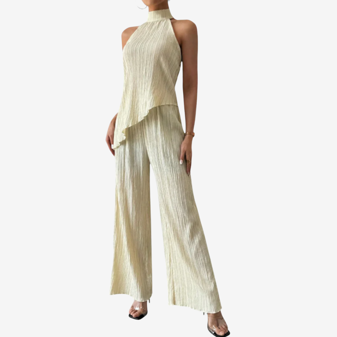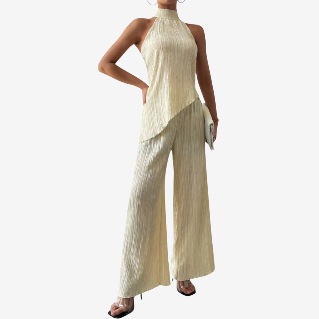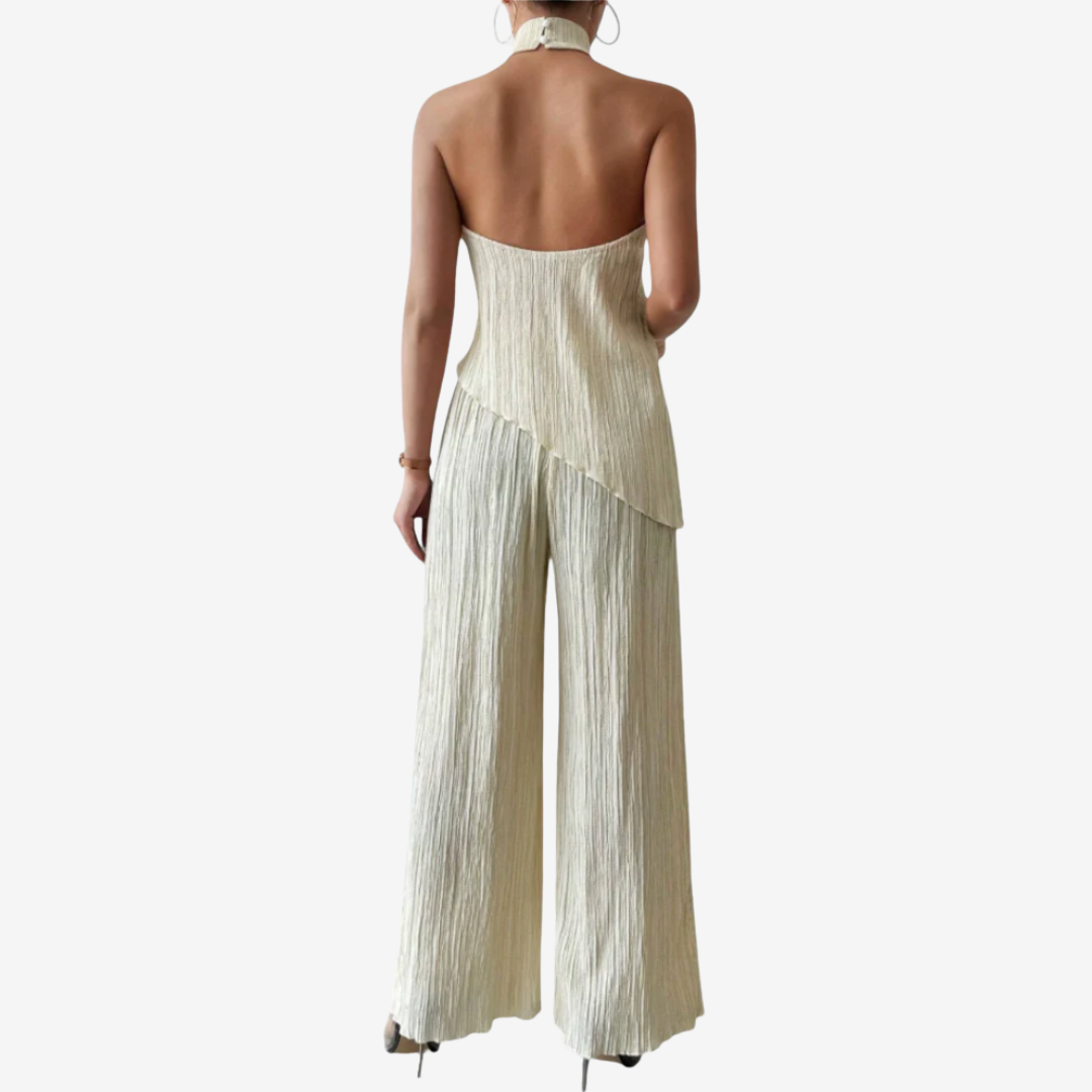 L'ensemble Eléanna™ respire l'élégance naturelle. Un haut dos nu chic sans manches, associé à un pantalon large taille haute en crêpe ivoire clair, crée une silhouette intemporelle. Le haut présente un décolleté drapé flatteur et un dos nu avec de délicates bretelles réglables pour un ajustement parfait. Le pantalon, quant à lui, présente des plis nets sur le devant et une ceinture ajustée qui souligne la taille tout en allongeant les jambes. Idéal pour les soirées d'été, les mariages ou les événements raffinés, ce look allie sophistication et confort.