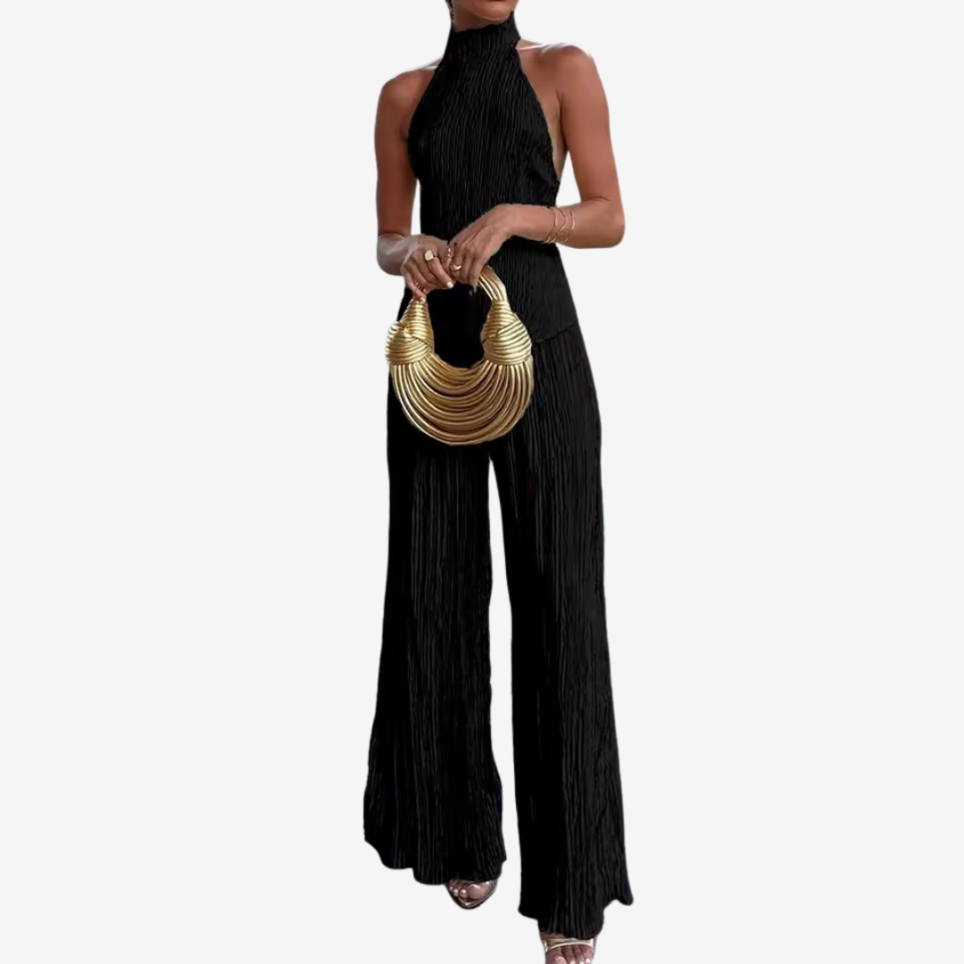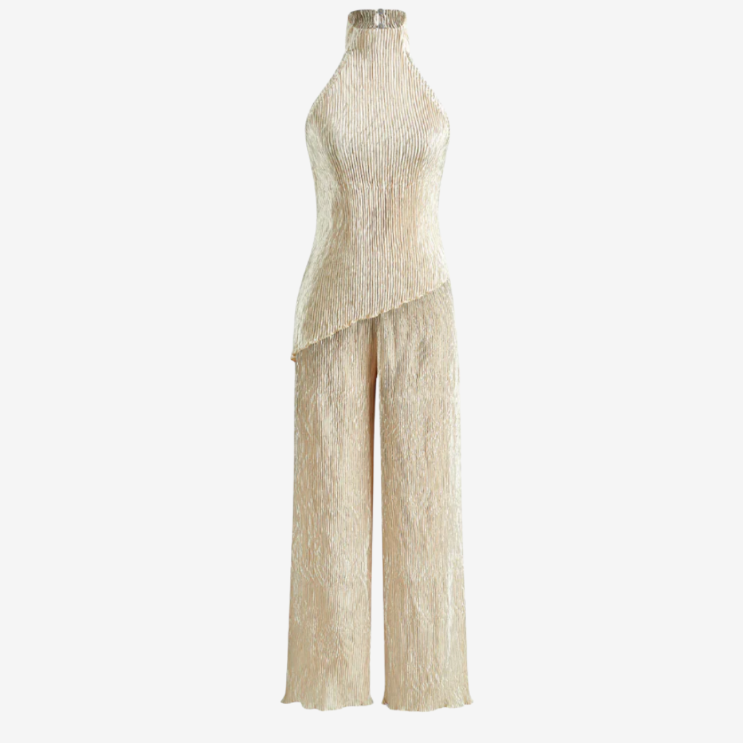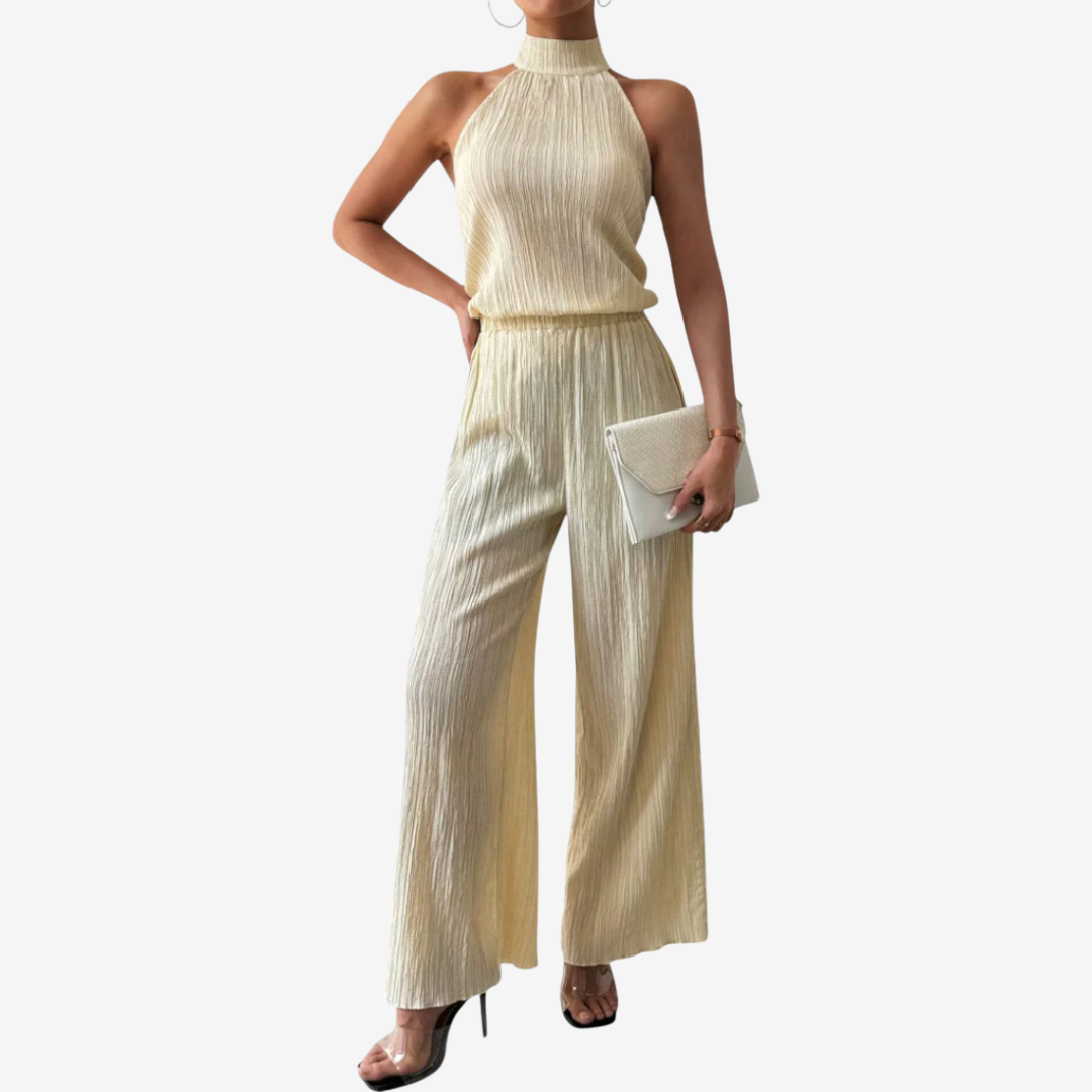 L'ensemble Eléanna™ respire l'élégance naturelle. Un haut dos nu chic sans manches, associé à un pantalon large taille haute en crêpe ivoire clair, crée une silhouette intemporelle. Le haut présente un décolleté drapé flatteur et un dos nu avec de délicates bretelles réglables pour un ajustement parfait. Le pantalon, quant à lui, présente des plis nets sur le devant et une ceinture ajustée qui souligne la taille tout en allongeant les jambes. Idéal pour les soirées d'été, les mariages ou les événements raffinés, ce look allie sophistication et confort.