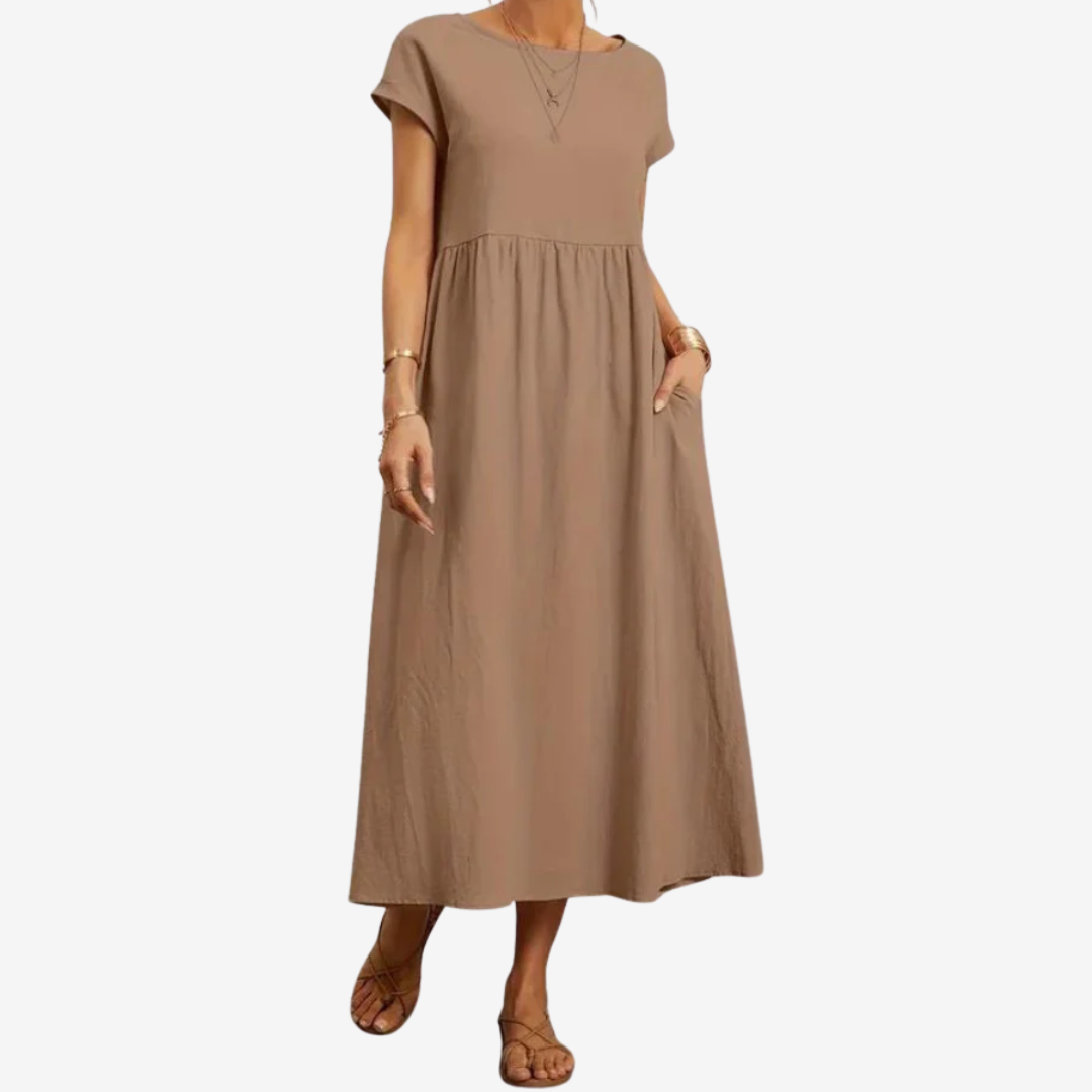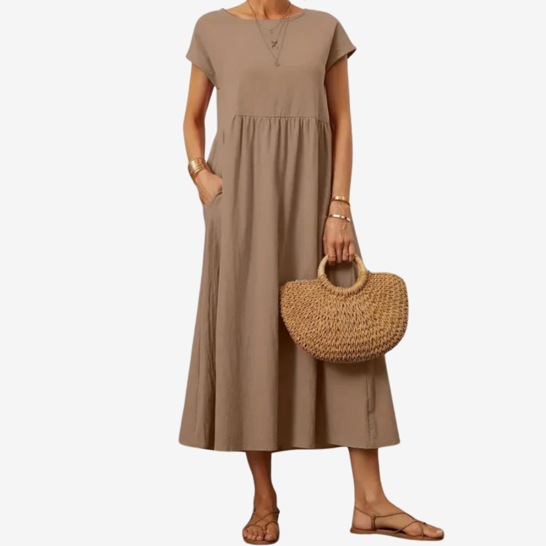 Découvrez la robe Lysiane™, un mélange naturel de confort et d'élégance. Confectionnée dans une matière respirante, cette robe midi présente une encolure dégagée délicate, des manches courtes et une taille décontractée qui se prolonge gracieusement en une jupe ample et aérienne. Ses poches latérales dissimulées lui confèrent un charme pratique, tandis que sa silhouette fluide crée du mouvement à chaque pas. Idéale pour les journées ensoleillées ou les soirées décontractées, Lysiane™ incarne la sophistication simple.