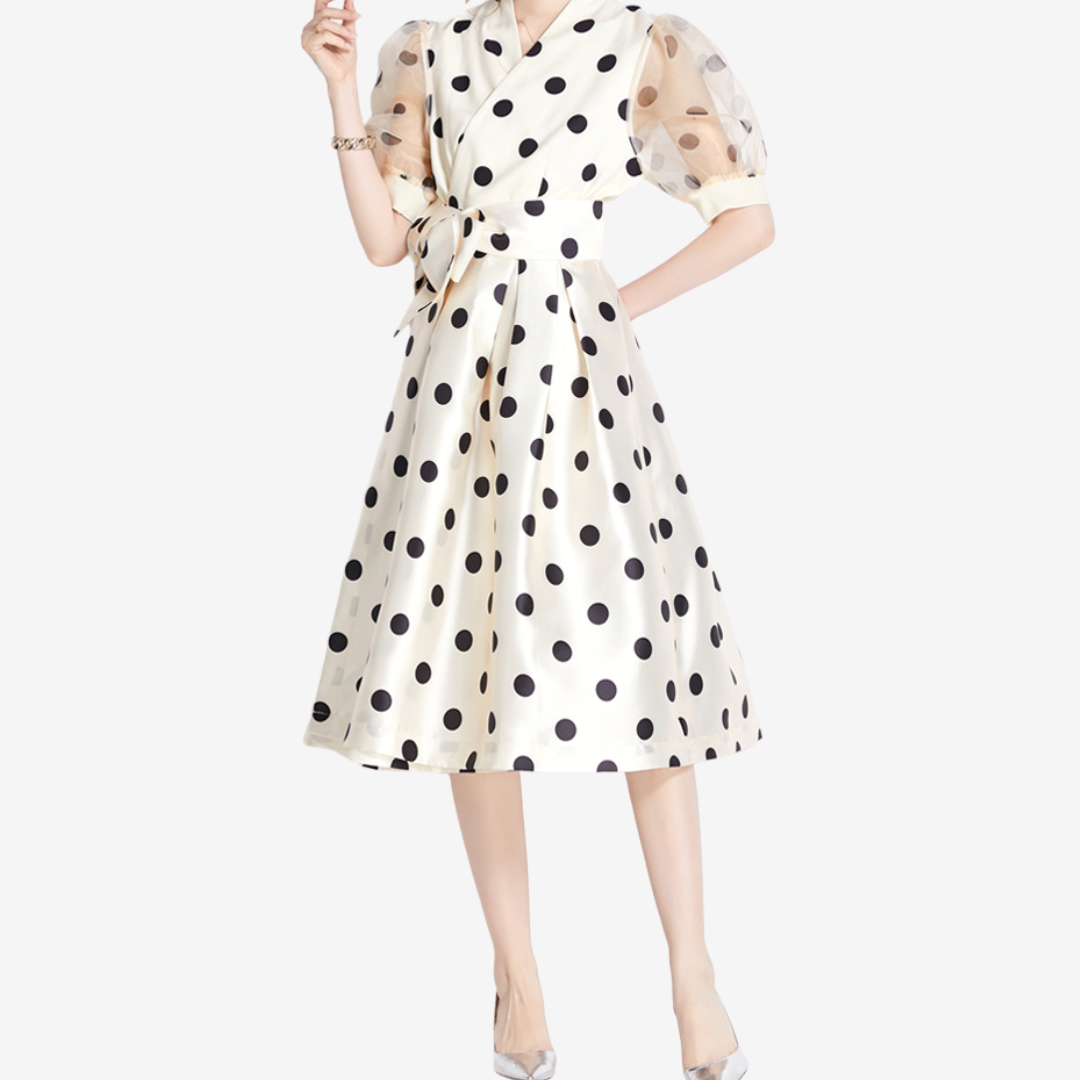 Adoptez un charme intemporel avec la robe à pois Natacha™, une pièce d'inspiration rétro qui célèbre la féminité avec une touche ludique. Dotée de délicates manches bouffantes en tulle transparent, d'une taille cintrée et d'une coupe trapèze classique, cette robe allie élégance vintage et modernité. Que vous assistiez à une garden-party, un brunch ou une soirée, Natacha™ attirera tous les regards.