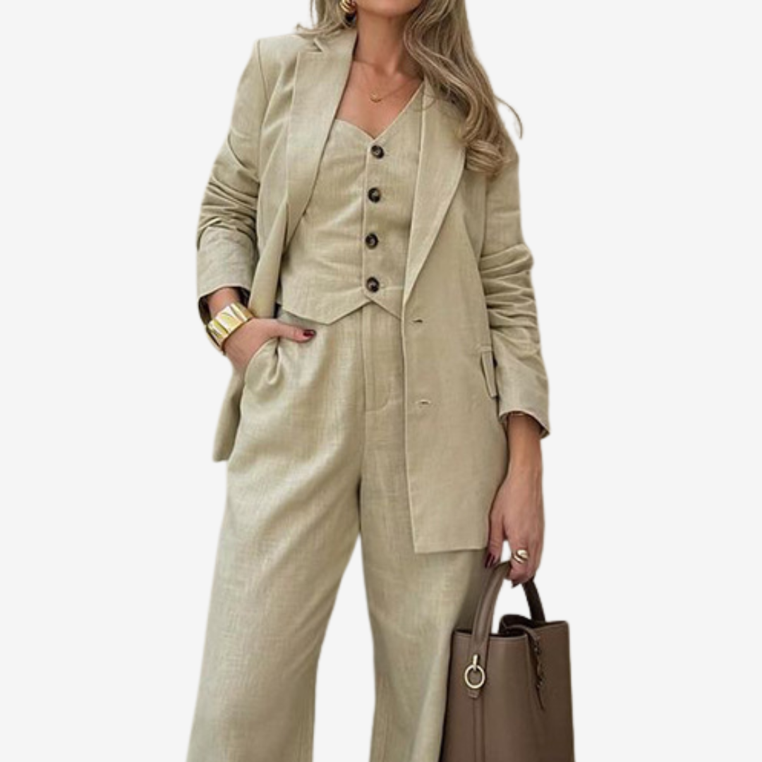 Découvrez Ninette™, l'incarnation du chic parisien. Cet ensemble trois pièces associe un élégant blazer ajusté, un gilet boutonné et un pantalon large taille haute. Ses tons beiges doux rehaussent son style intemporel, tandis que son tissu léger épouse la silhouette pour une sophistication décontractée. Polyvalent pour les réunions d'affaires, les brunchs élégants ou les balades en ville, ce costume s'adapte à votre journée : il vous suffit de changer de chaussures et d'accessoires.